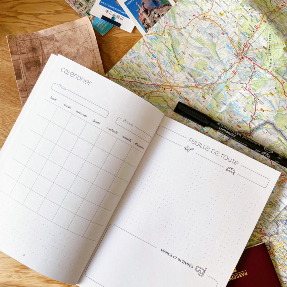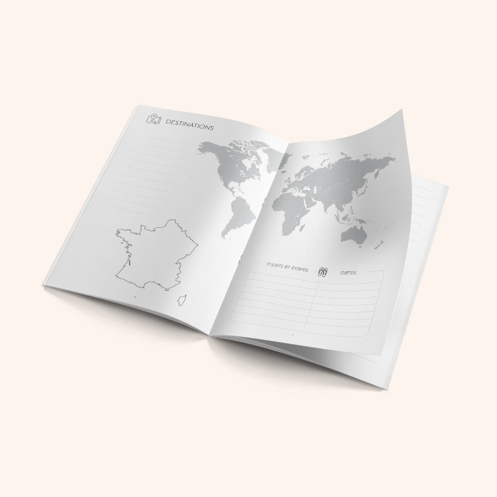 • une nouvelle fabrication avec plus de pages!• 96 pages pour organiser et raconter son voyage : Destinations / Préparation / 28 doubles-pages de récit de voyage / 2 doubles-pages de croquis / 3 doubles-pages pour le collage de photos / 8 doubles-pages pour les moments forts / infos utiles / dépenses.