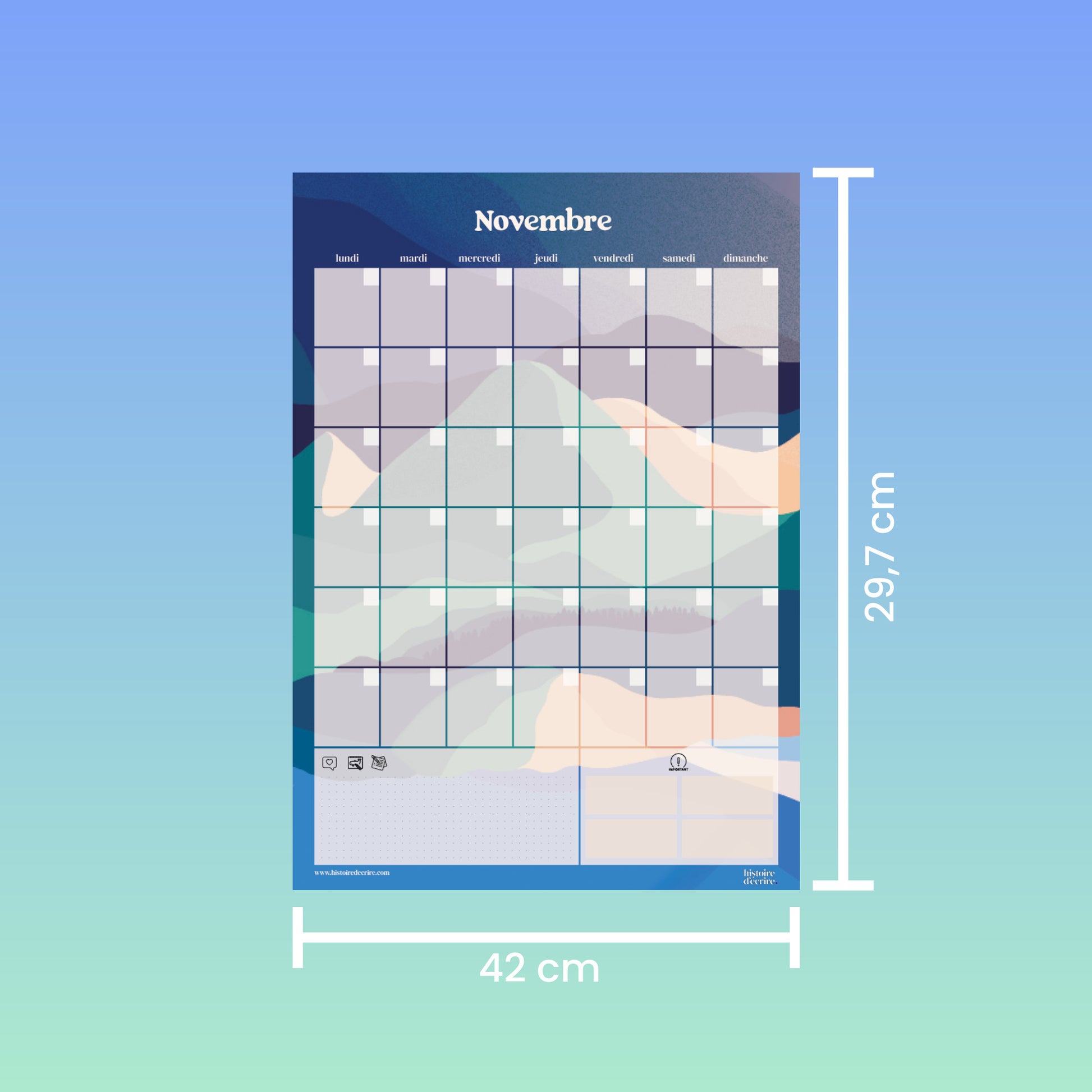 - Dimensions : A3 : 29,7 x 42 cm par mois